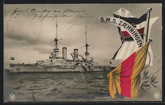 AK Kriegsschiff S.M.S. Zaehringen im Austausch mit einem Beiboot, Reichskriegsflagge