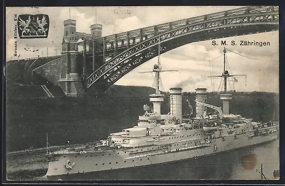 AK Kriegsschiff SMS Zähringen unter der Levensauer Hochbrücke