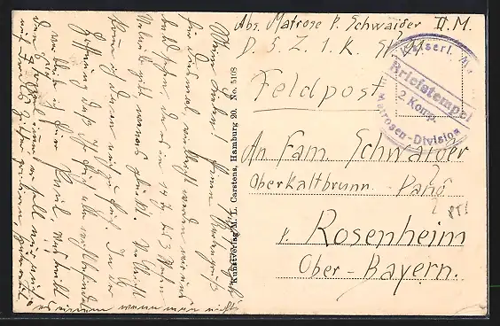 Personenbezogene Daten auf der Rückseite der Karte wurden durch blauen Textmarker unkenntlich gemacht. Die blauen Stellen sind auf die Vorderseite durchgeweicht und wirken sich negativ auf das Postkartenfoto aus