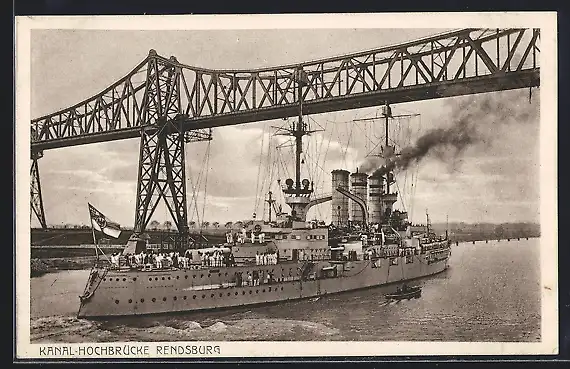 AK Kriegsschiff der Kaiserlichen Marine unterfährt die Hochbrücke in Rendsburg