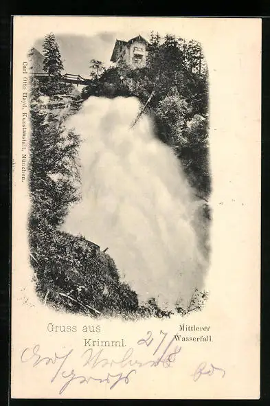 AK Krimml, Mittlerer Wasserfall mit Gasthaus