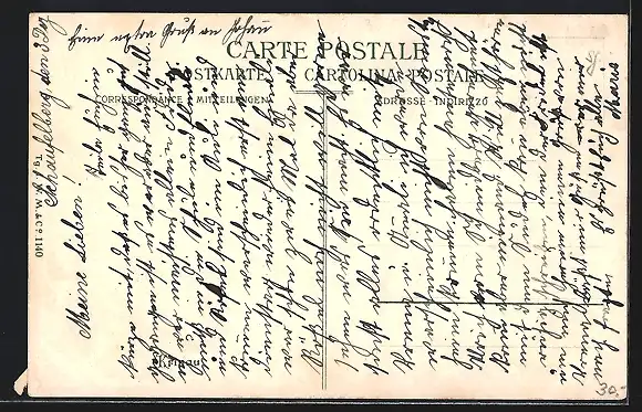 Personenbezogene Daten auf der Rückseite der Karte wurden durch blauen Textmarker unkenntlich gemacht. Die blauen Stellen sind auf die Vorderseite durchgeweicht und wirken sich negativ auf das Postkartenfoto aus