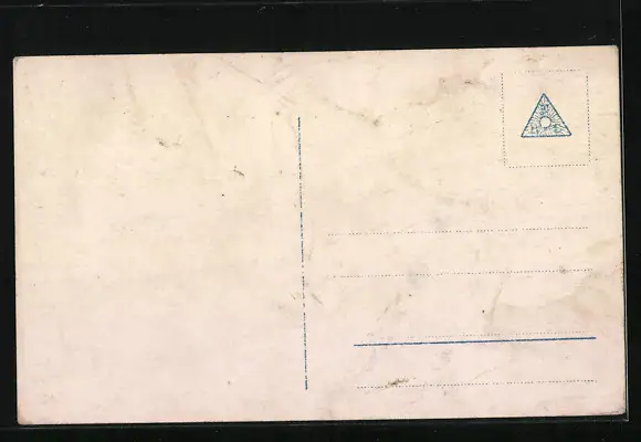 Personenbezogene Daten auf der Rückseite der Karte wurden durch blauen Textmarker unkenntlich gemacht. Die blauen Stellen sind auf die Vorderseite durchgeweicht und wirken sich negativ auf das Postkartenfoto aus