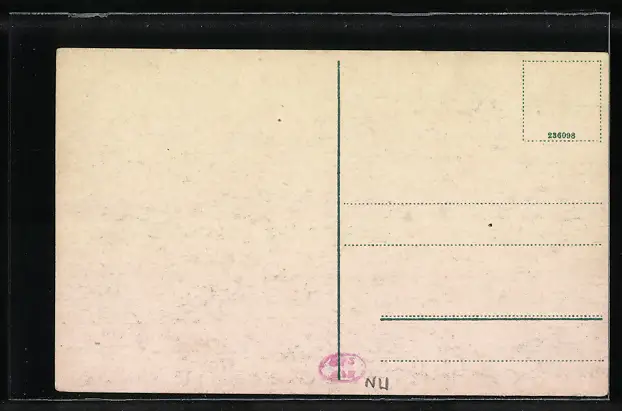 Personenbezogene Daten auf der Rückseite der Karte wurden durch blauen Textmarker unkenntlich gemacht. Die blauen Stellen sind auf die Vorderseite durchgeweicht und wirken sich negativ auf das Postkartenfoto aus