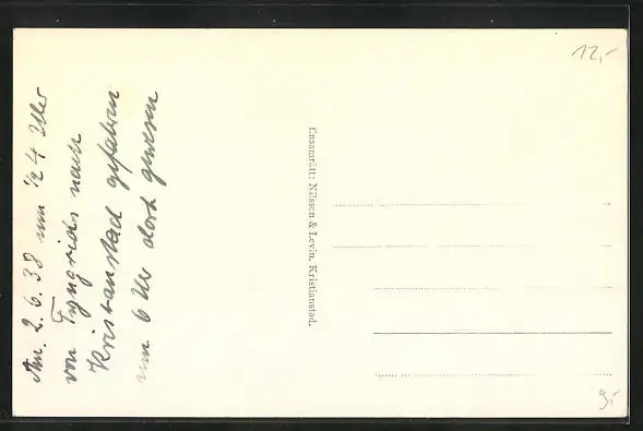 Personenbezogene Daten auf der Rückseite der Karte wurden durch blauen Textmarker unkenntlich gemacht. Die blauen Stellen sind auf die Vorderseite durchgeweicht und wirken sich negativ auf das Postkartenfoto aus