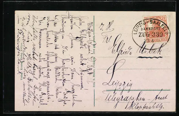 Personenbezogene Daten auf der Rückseite der Karte wurden durch blauen Textmarker unkenntlich gemacht. Die blauen Stellen sind auf die Vorderseite durchgeweicht und wirken sich negativ auf das Postkartenfoto aus
