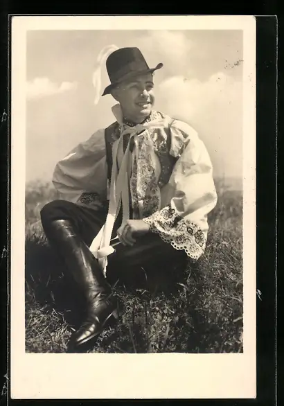 AK Kroje z Mor. slovácka, charmanter Mann in Tracht auf einer Wiese sitzend