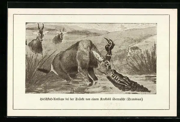 AK Krokodil überrascht Hirschkuh-Antilope an der Tränke