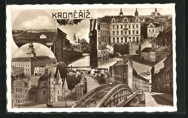 AK Kromeriz, Brücke, Kirche, Strassenpartie mit Geschäften