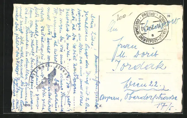 Personenbezogene Daten auf der Rückseite der Karte wurden durch blauen Textmarker unkenntlich gemacht. Die blauen Stellen sind auf die Vorderseite durchgeweicht und wirken sich negativ auf das Postkartenfoto aus