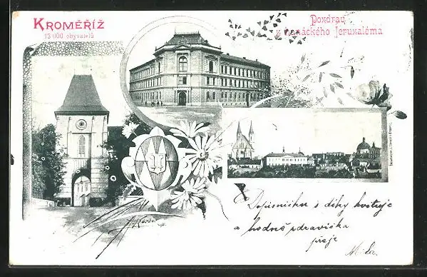 AK Kromeriz, Panorama, Ortspartie und Torbogen