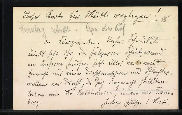 Personenbezogene Daten auf der Rückseite der Karte wurden durch blauen Textmarker unkenntlich gemacht. Die blauen Stellen sind auf die Vorderseite durchgeweicht und wirken sich negativ auf das Postkartenfoto aus
