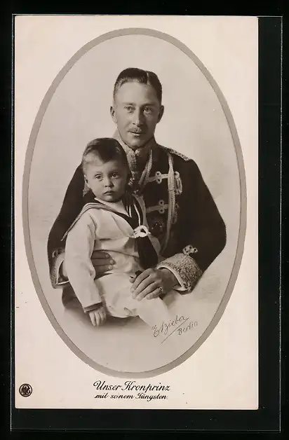 AK Kronprinz Wilhelm von Preussen in Uniform mit seinem jüngsten Sohn in Matrosenkleidung auf dem Schoss