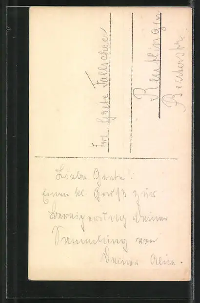 Personenbezogene Daten auf der Rückseite der Karte wurden durch blauen Textmarker unkenntlich gemacht. Die blauen Stellen sind auf die Vorderseite durchgeweicht und wirken sich negativ auf das Postkartenfoto aus
