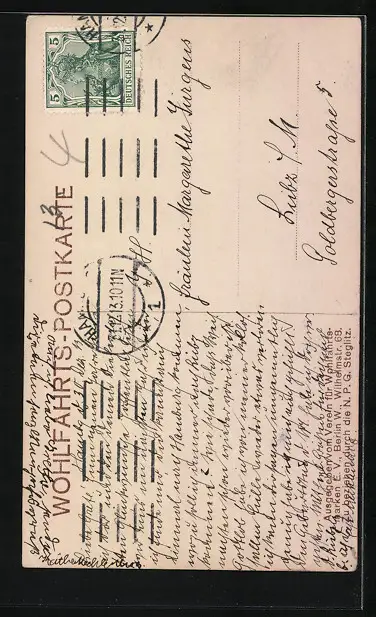 Personenbezogene Daten auf der Rückseite der Karte wurden durch blauen Textmarker unkenntlich gemacht. Die blauen Stellen sind auf die Vorderseite durchgeweicht und wirken sich negativ auf das Postkartenfoto aus
