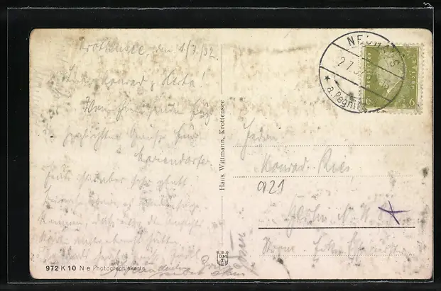 Personenbezogene Daten auf der Rückseite der Karte wurden durch blauen Textmarker unkenntlich gemacht. Die blauen Stellen sind auf die Vorderseite durchgeweicht und wirken sich negativ auf das Postkartenfoto aus