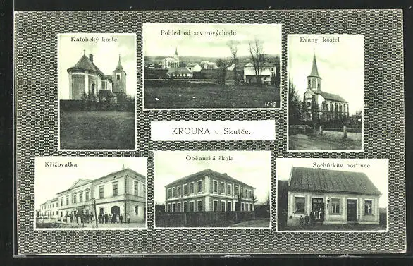 AK Krouna u Skutce, Pohled od severovychodu, Evang. kostel, Sochurkuv hostinec