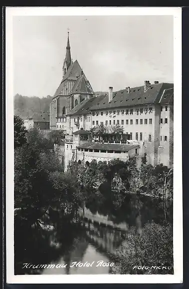 AK Krumau / Cesky Krumlov, Flusspartie und Hotel Rose