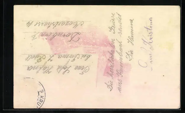 Personenbezogene Daten auf der Rückseite der Karte wurden durch blauen Textmarker unkenntlich gemacht. Die blauen Stellen sind auf die Vorderseite durchgeweicht und wirken sich negativ auf das Postkartenfoto aus