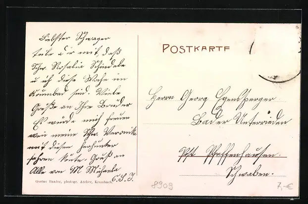 Personenbezogene Daten auf der Rückseite der Karte wurden durch blauen Textmarker unkenntlich gemacht. Die blauen Stellen sind auf die Vorderseite durchgeweicht und wirken sich negativ auf das Postkartenfoto aus
