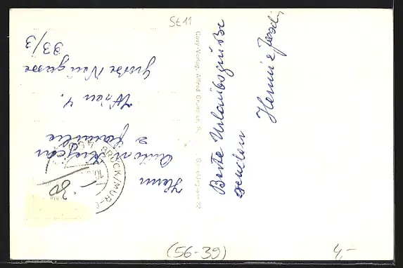 Personenbezogene Daten auf der Rückseite der Karte wurden durch blauen Textmarker unkenntlich gemacht. Die blauen Stellen sind auf die Vorderseite durchgeweicht und wirken sich negativ auf das Postkartenfoto aus