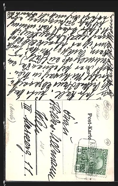 Personenbezogene Daten auf der Rückseite der Karte wurden durch blauen Textmarker unkenntlich gemacht. Die blauen Stellen sind auf die Vorderseite durchgeweicht und wirken sich negativ auf das Postkartenfoto aus