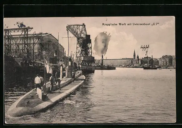 AK Krupp`sche Werft mit U-Boot U7 in See stechend