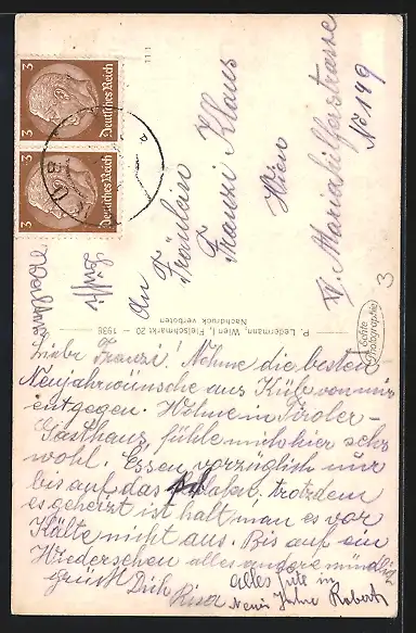 Personenbezogene Daten auf der Rückseite der Karte wurden durch blauen Textmarker unkenntlich gemacht. Die blauen Stellen sind auf die Vorderseite durchgeweicht und wirken sich negativ auf das Postkartenfoto aus