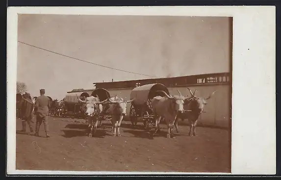AK Kühe vor Planenwagen gespannt
