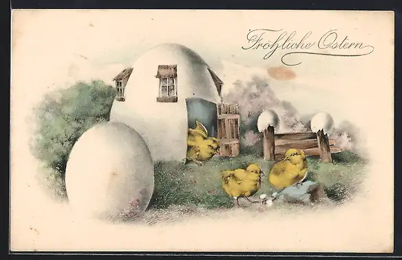 AK Küken am Eierschalenhaus, Fröhliche Ostern!
