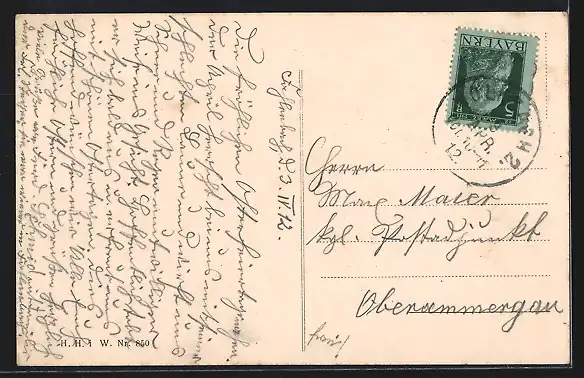 Personenbezogene Daten auf der Rückseite der Karte wurden durch blauen Textmarker unkenntlich gemacht. Die blauen Stellen sind auf die Vorderseite durchgeweicht und wirken sich negativ auf das Postkartenfoto aus