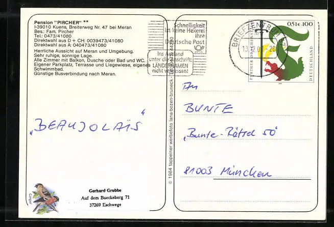 AK Kuens b. Meran, Pension Pircher, Breiterweg Nr. 47