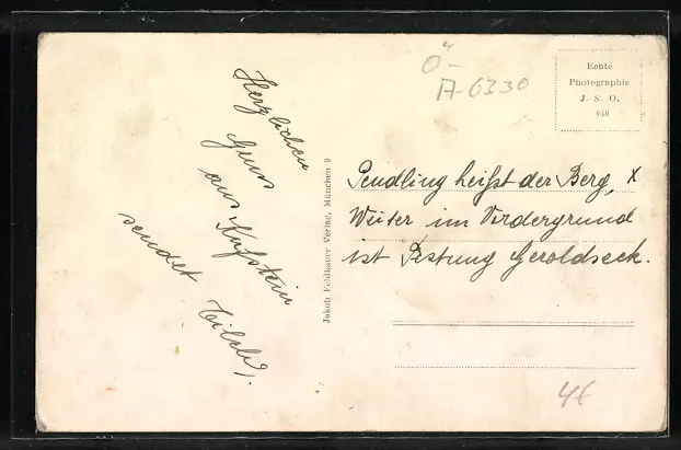 Personenbezogene Daten auf der Rückseite der Karte wurden durch blauen Textmarker unkenntlich gemacht. Die blauen Stellen sind auf die Vorderseite durchgeweicht und wirken sich negativ auf das Postkartenfoto aus