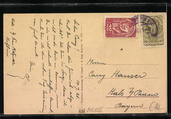 Personenbezogene Daten auf der Rückseite der Karte wurden durch blauen Textmarker unkenntlich gemacht. Die blauen Stellen sind auf die Vorderseite durchgeweicht und wirken sich negativ auf das Postkartenfoto aus