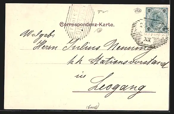 Personenbezogene Daten auf der Rückseite der Karte wurden durch blauen Textmarker unkenntlich gemacht. Die blauen Stellen sind auf die Vorderseite durchgeweicht und wirken sich negativ auf das Postkartenfoto aus