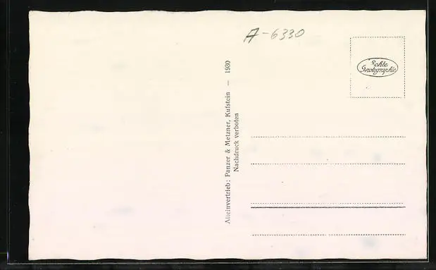 Personenbezogene Daten auf der Rückseite der Karte wurden durch blauen Textmarker unkenntlich gemacht. Die blauen Stellen sind auf die Vorderseite durchgeweicht und wirken sich negativ auf das Postkartenfoto aus