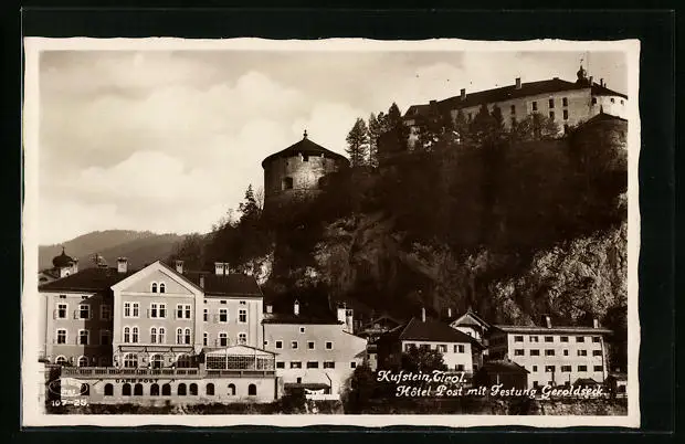 AK Kufstein, Hotel Post mit der Festung Geroldseck