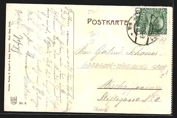 Personenbezogene Daten auf der Rückseite der Karte wurden durch blauen Textmarker unkenntlich gemacht. Die blauen Stellen sind auf die Vorderseite durchgeweicht und wirken sich negativ auf das Postkartenfoto aus
