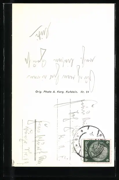 Personenbezogene Daten auf der Rückseite der Karte wurden durch blauen Textmarker unkenntlich gemacht. Die blauen Stellen sind auf die Vorderseite durchgeweicht und wirken sich negativ auf das Postkartenfoto aus