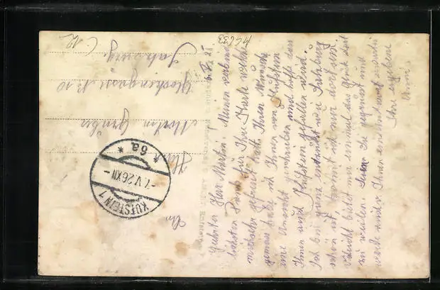 Personenbezogene Daten auf der Rückseite der Karte wurden durch blauen Textmarker unkenntlich gemacht. Die blauen Stellen sind auf die Vorderseite durchgeweicht und wirken sich negativ auf das Postkartenfoto aus