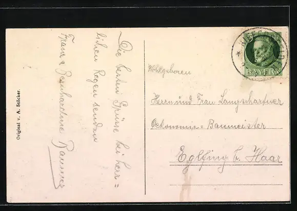Personenbezogene Daten auf der Rückseite der Karte wurden durch blauen Textmarker unkenntlich gemacht. Die blauen Stellen sind auf die Vorderseite durchgeweicht und wirken sich negativ auf das Postkartenfoto aus