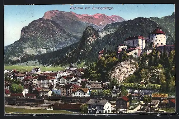 AK Kufstein, Teilansicht mit Kaisergebirge und Festung, Bergglühen