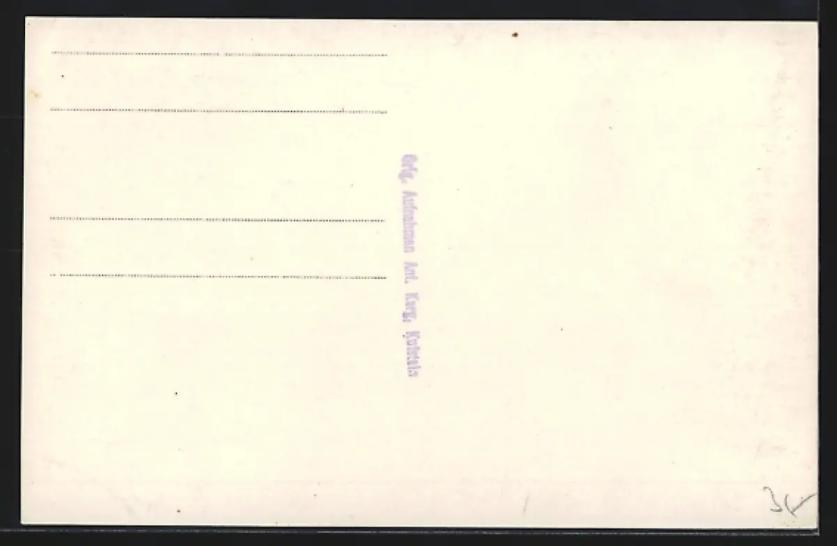 Personenbezogene Daten auf der Rückseite der Karte wurden durch blauen Textmarker unkenntlich gemacht. Die blauen Stellen sind auf die Vorderseite durchgeweicht und wirken sich negativ auf das Postkartenfoto aus