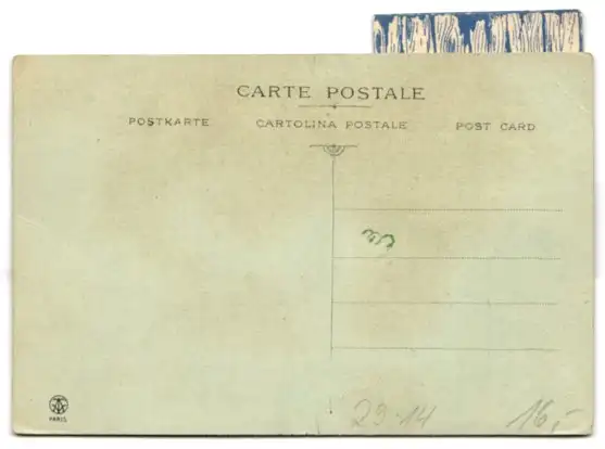 Personenbezogene Daten auf der Rückseite der Karte wurden durch blauen Textmarker unkenntlich gemacht. Die blauen Stellen sind auf die Vorderseite durchgeweicht und wirken sich negativ auf das Postkartenfoto aus