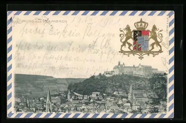 AK Kulmbach, Ortsansicht aus der Vogelschau mit Wappen