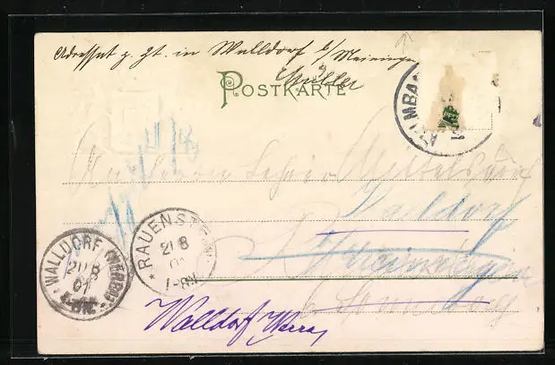 Personenbezogene Daten auf der Rückseite der Karte wurden durch blauen Textmarker unkenntlich gemacht. Die blauen Stellen sind auf die Vorderseite durchgeweicht und wirken sich negativ auf das Postkartenfoto aus