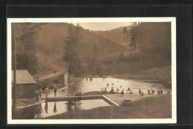 Personenbezogene Daten auf der Rückseite der Karte wurden durch blauen Textmarker unkenntlich gemacht. Die blauen Stellen sind auf die Vorderseite durchgeweicht und wirken sich negativ auf das Postkartenfoto aus