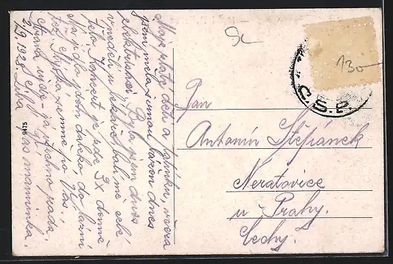 Personenbezogene Daten auf der Rückseite der Karte wurden durch blauen Textmarker unkenntlich gemacht. Die blauen Stellen sind auf die Vorderseite durchgeweicht und wirken sich negativ auf das Postkartenfoto aus