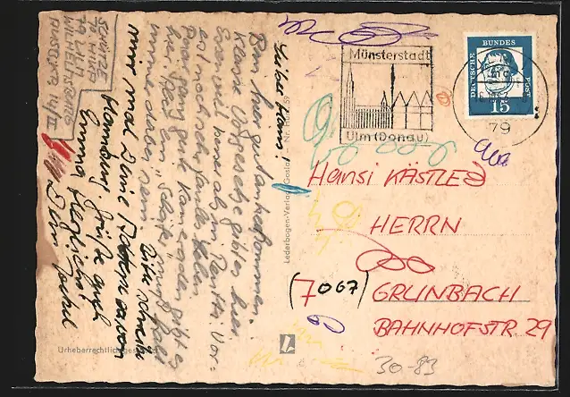 Personenbezogene Daten auf der Rückseite der Karte wurden durch blauen Textmarker unkenntlich gemacht. Die blauen Stellen sind auf die Vorderseite durchgeweicht und wirken sich negativ auf das Postkartenfoto aus