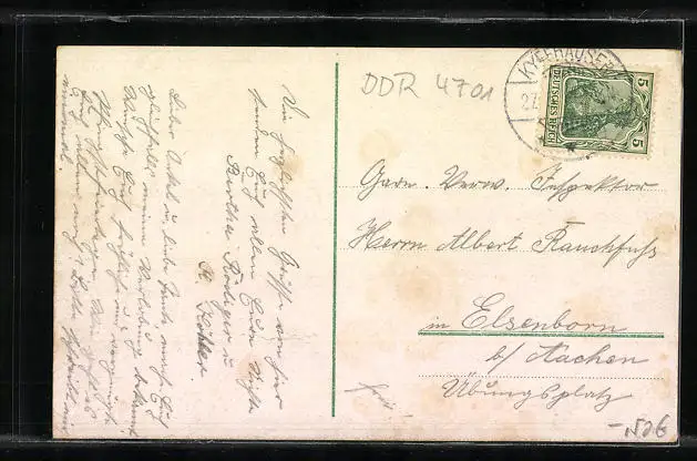 Personenbezogene Daten auf der Rückseite der Karte wurden durch blauen Textmarker unkenntlich gemacht. Die blauen Stellen sind auf die Vorderseite durchgeweicht und wirken sich negativ auf das Postkartenfoto aus